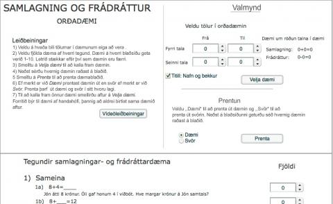 Nú geturðu prentað út dæmablöð með orða- eða töludæmum eins og þú vilt. Þú getur valið gerð dæma, tölur sem birtast í dæmum og uppsetningu. Engin tvö dæmi verða eins. Auðvelt að velja dæmi sem henta hverjum nemenda. Orðadæmi í samlagningu og frádrætti eru oft greind í 11 flokka eftir því hvaða atriði er verið að þjálfa. Forritið gerir kleift að raða dæmum saman á blað eftir tegundum. Valið er hve mörg dæmi úr hverjum flokki birtast og á hvaða bili tölurnar í dæmunum eiga að vera. Forritið sér síðan um að búa til orðadæmi þar sem engin tvö dæmi verða eins. Hægt er því að prenta ótakarkamaðan fjölda af dæmablöðum, þar sem nemendur glíma alltaf við ný og ný dæmi. Svör fylgja.